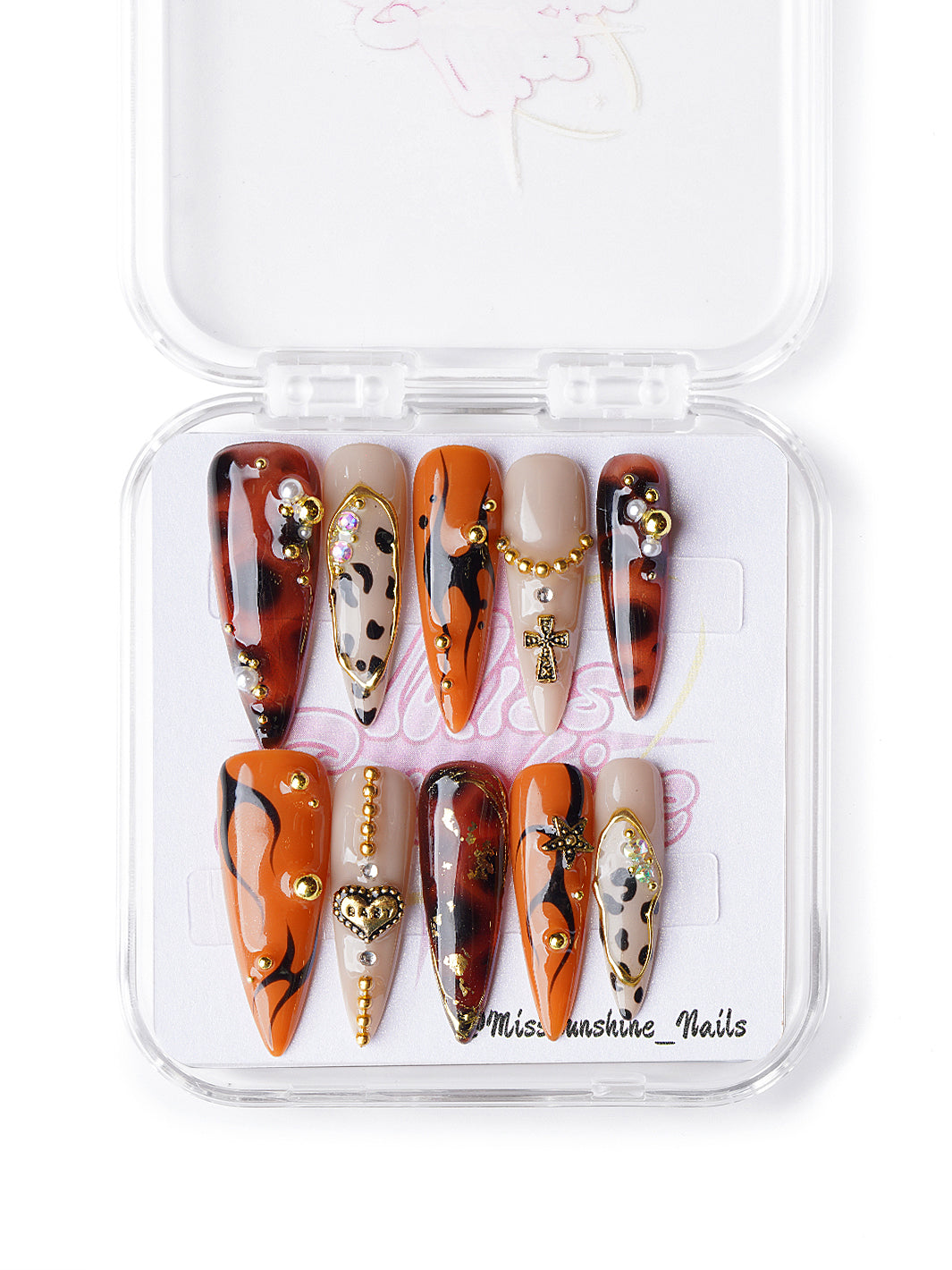 Meet Golden Pattern — a luxe, fall-perfect press-on set that mixes tortoiseshell swirls, leopard print, and bright orange flames with opulent gold hardware. Each long stiletto nail is decked out in rich brown and pumpkin tones, featuring golden heart charms, gem chains, and metallic accents. It’s bold, spicy, and dripping in glam — perfect for Halloween or autumn nights that need a little heat.