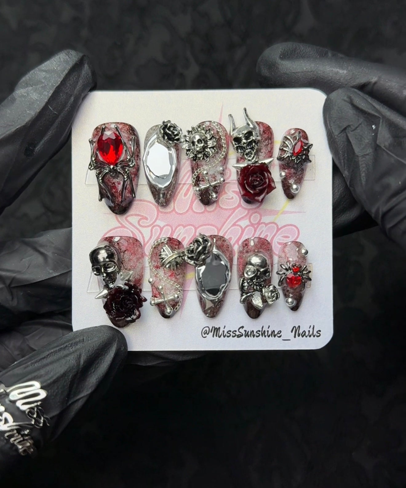Dare to terrify in Horror Scare — a blood-chilling short almond press-on set made for horror lovers and Halloween scream queens. Featuring deep red gems, sculpted skulls, twisted metal roses, devil horns, and gothic cross charms, this set blends dark romance with sinister edge. The rose-tinted chrome base gives each nail a haunted elegance that’s creepy, classy, and unforgettable.