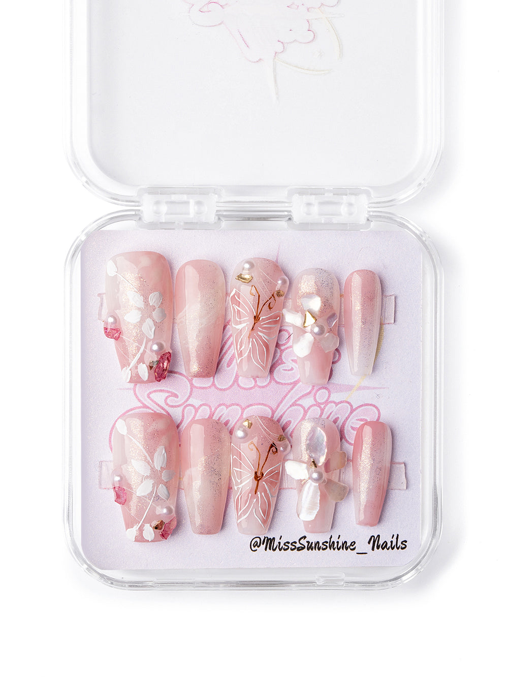 Step into a world of delicate sparkle with "Flower Season B" — a medium-long coffin nail set featuring a soft pink translucent base, hand-painted floral art, gold butterfly accents, and shimmering crystal details. Elegant yet playful, this set brings a fresh, garden-inspired charm that's perfect for bridal looks, spring events, or everyday romantic elegance. Key words: pink, white,floral,flower,ombre,butterfly,pearl