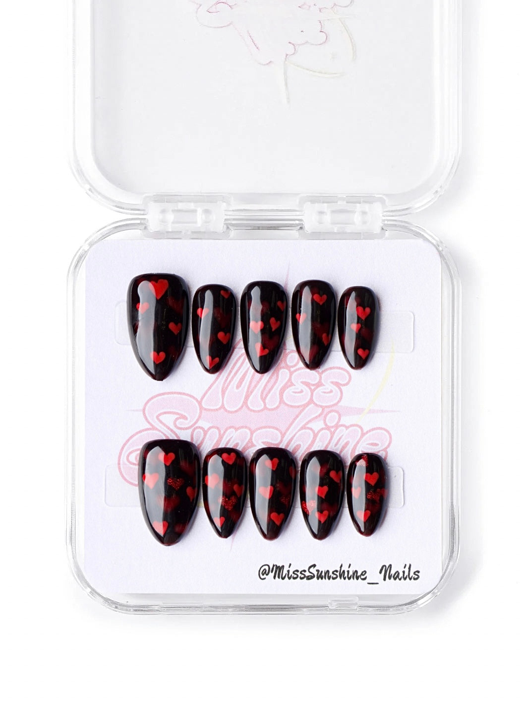 Dark Heart brings moody romance to your fingertips. This extra short almond press-on nail set features a glossy black cherry base adorned with scattered red hearts — a subtle yet striking look for Valentine’s Day and beyond. Perfect for those who like their sweetness with a little edge.