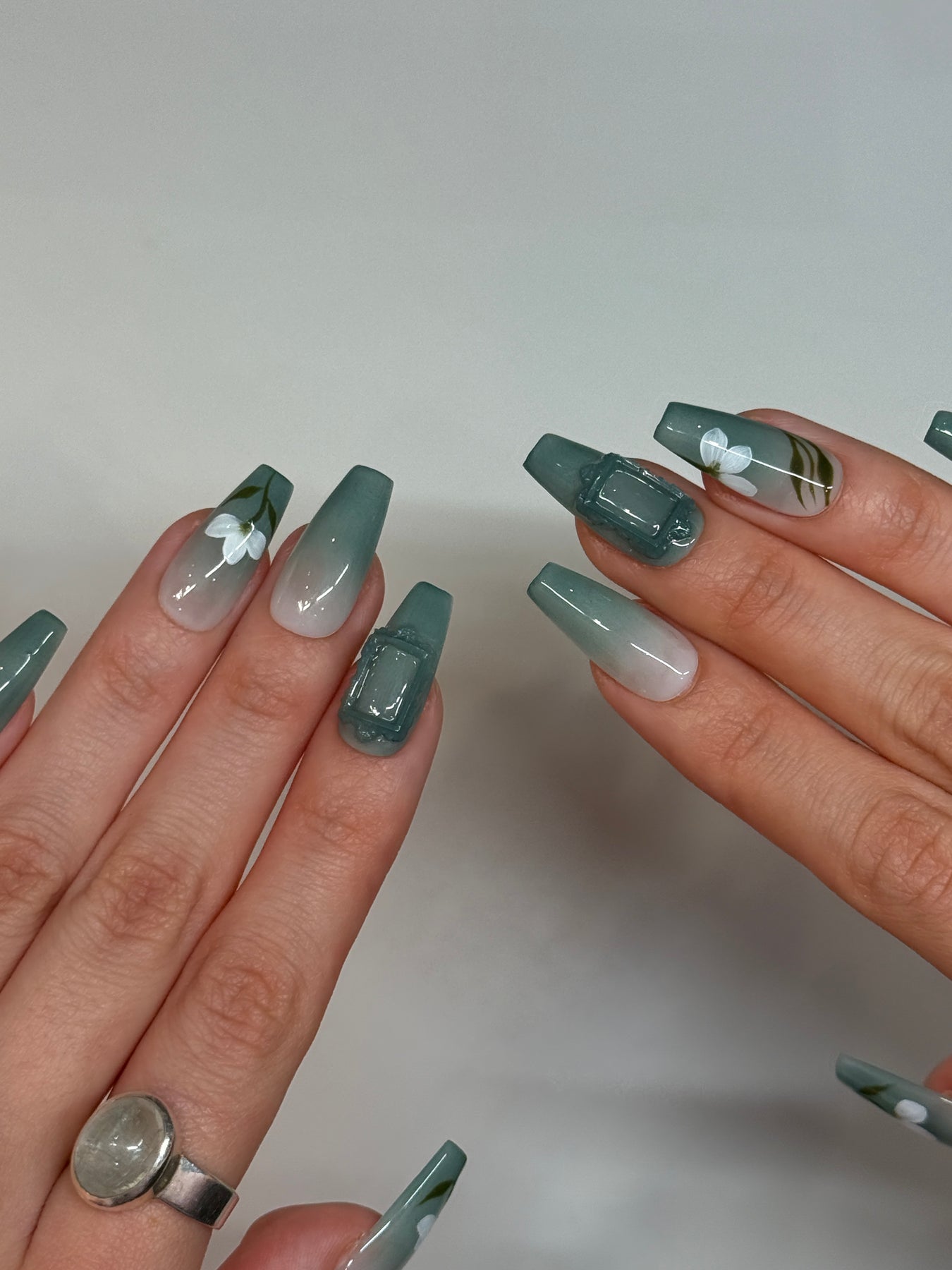 Serene and modern, "Flower Season J" is a medium-long coffin nail set featuring a calming jade green gradient, translucent finishes, and hand-painted white lotus flower details. Accented with subtle 3D textures and a glossy top coat, this set evokes a peaceful pond garden vibe—perfect for minimalists, nature lovers, or anyone seeking quiet elegance with a fresh twist. key words: jade,green,white,ombre,floral,flower,garden