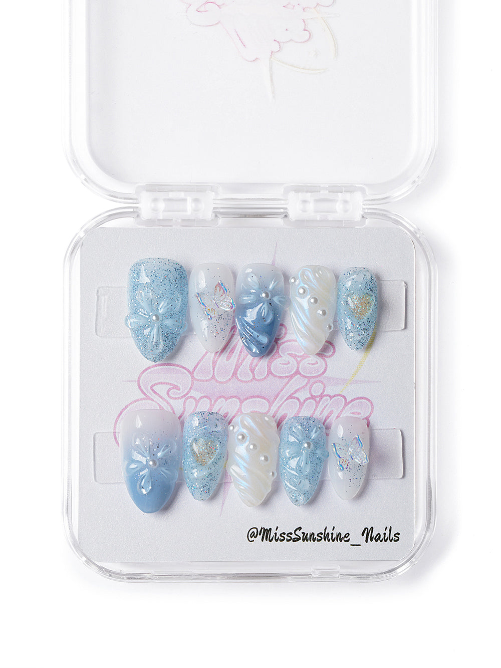 Aqua Petal is an extra short almond press-on nail set that captures the soft beauty of the sea. Featuring glittery ocean blue tones, delicate 3D petals, pearl details, and subtle butterfly accents, this handmade design offers a touch of sparkle and serenity in a cute, wearable length. Perfect for everyday elegance with a dreamy coastal twist.